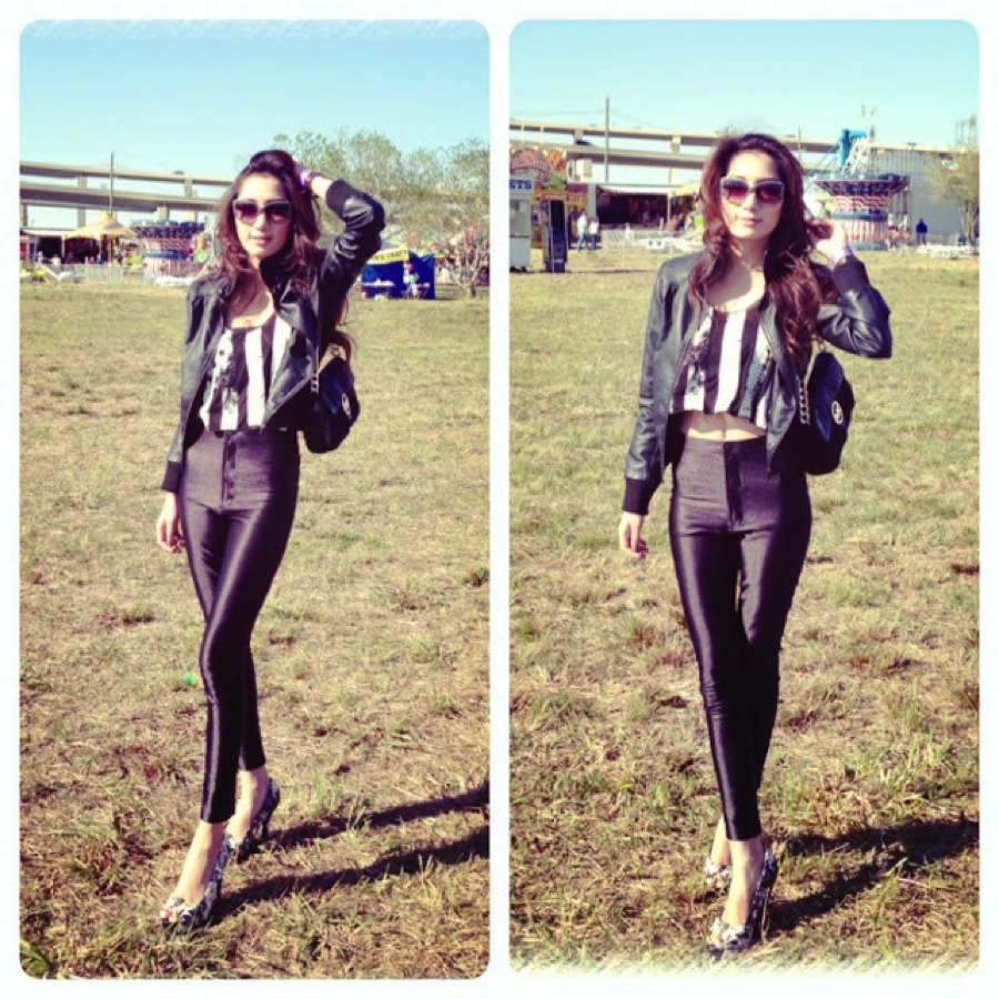 I matched my short top printed in black/white American flag with black high-waist American Apparel disco pants. Since it was so cold on that day, I added my black leather jacket over it to keep me warm and ready to rock! Yayyyyy